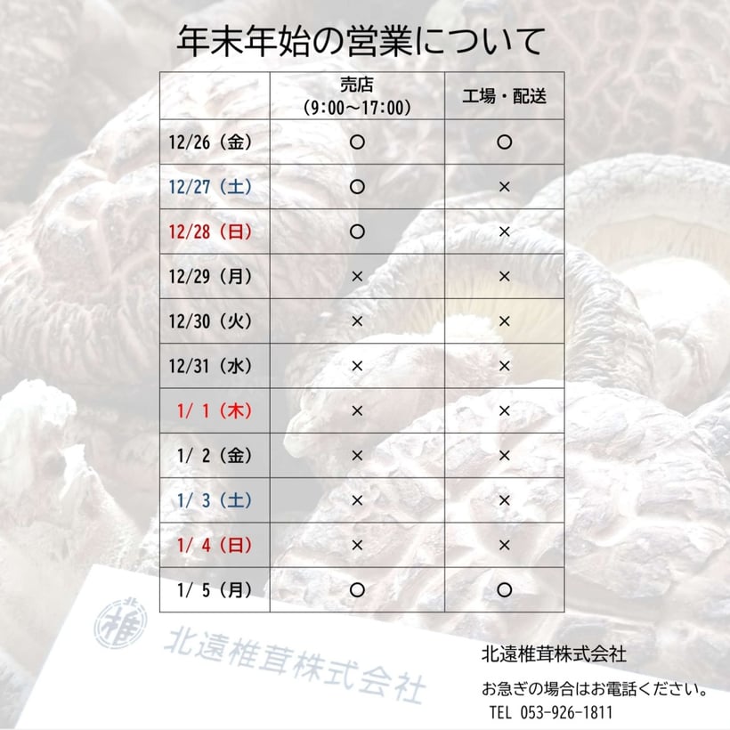2025/12/24 【年末年始休業のお知らせ】 ★売店 12月29日〜1月4日は休業とさせていただきます。 お急ぎの方は053-926-1811までお電話ください。 ★工場 12月27日〜1月4日は休業とさせていただきます。 (出荷も停止させていただきます。) お急ぎの方は053-926-1811までお電話ください。 tagPlaceholderカテゴリ: